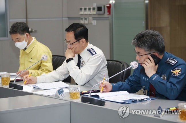 (서울=연합뉴스) 김승두 기자 = 30일 오전 정부서울청사 중앙재난안전상황실 서울상황센터에서 열린 이천 화재 관계장관 회의에 정문호 소방청장(가운데)과 민갑룡 경찰청장(오른쪽)이 참석해 있다. 2020.4.30